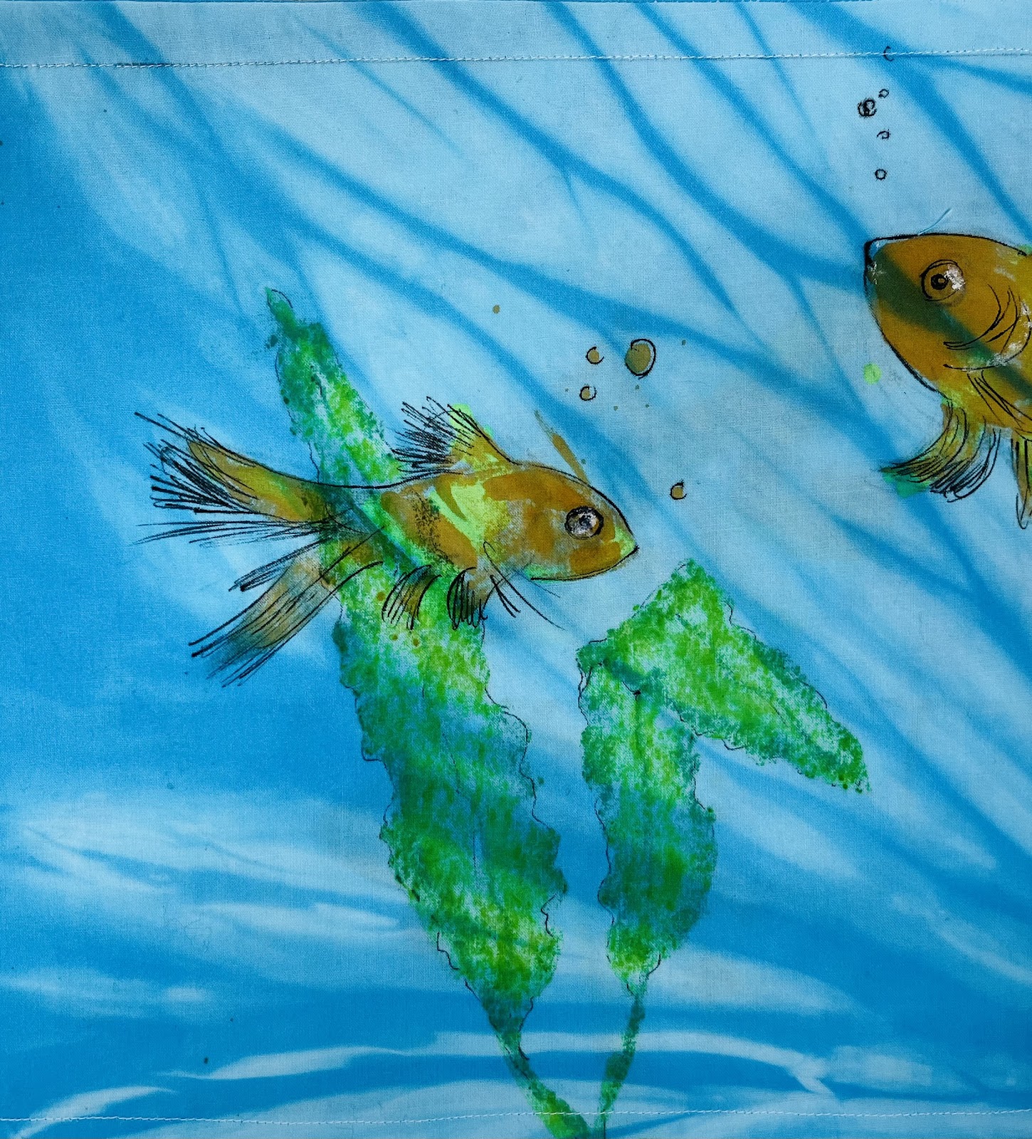 They are to be environmentally themed banners. The last two that I made a while ago were flowers and cacti. This time I chose fish, mainly becasue I had a huge stash of fish fabric. The flags are two sided so I had to make 10 panels for my five flags.